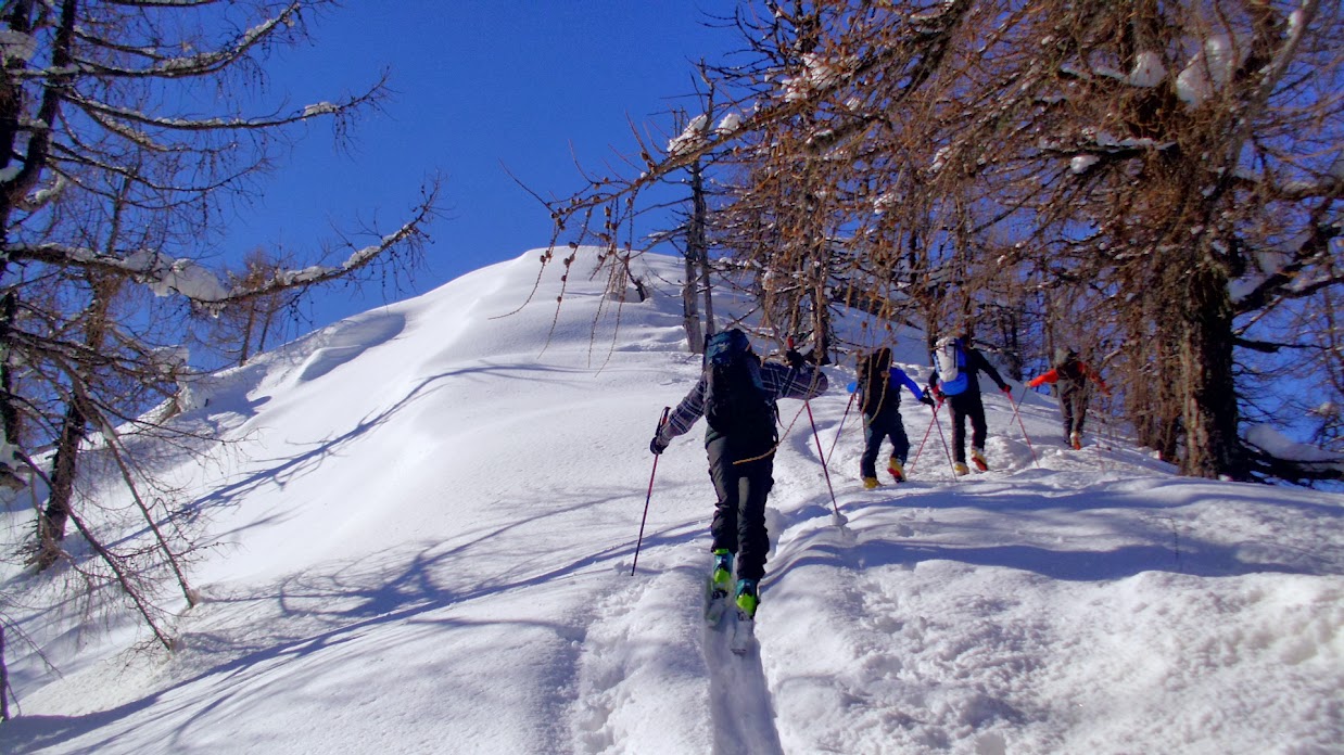 PREMESSA. Quando iniziai a praticare lo sci alpinismo, ad inizio anni ottanta, la stagione cominciava a marzo e proseguiva, a seconda dell’innevamento, fino ad inizio estate. La neve era già “trasformata” ed assestata. Si trovavano spesso condizioni ottimali e sicure. Al giorno d’oggi l’esplosione di questo sport e le attrezzature sempre più “tecniche” fanno sì che s’inizino le uscite con le pelli già alla prima neve. Il rischio è di trovarsi spesso in condizioni di minor sicurezza sui percorsi sci-alpinistici classici e di incontrare più difficilmente neve “sciabile”. Per questo la gita di seguito descritta, pur sicura per l’ambiente in cui si svolge, non ci ha regalato una bella discesa.