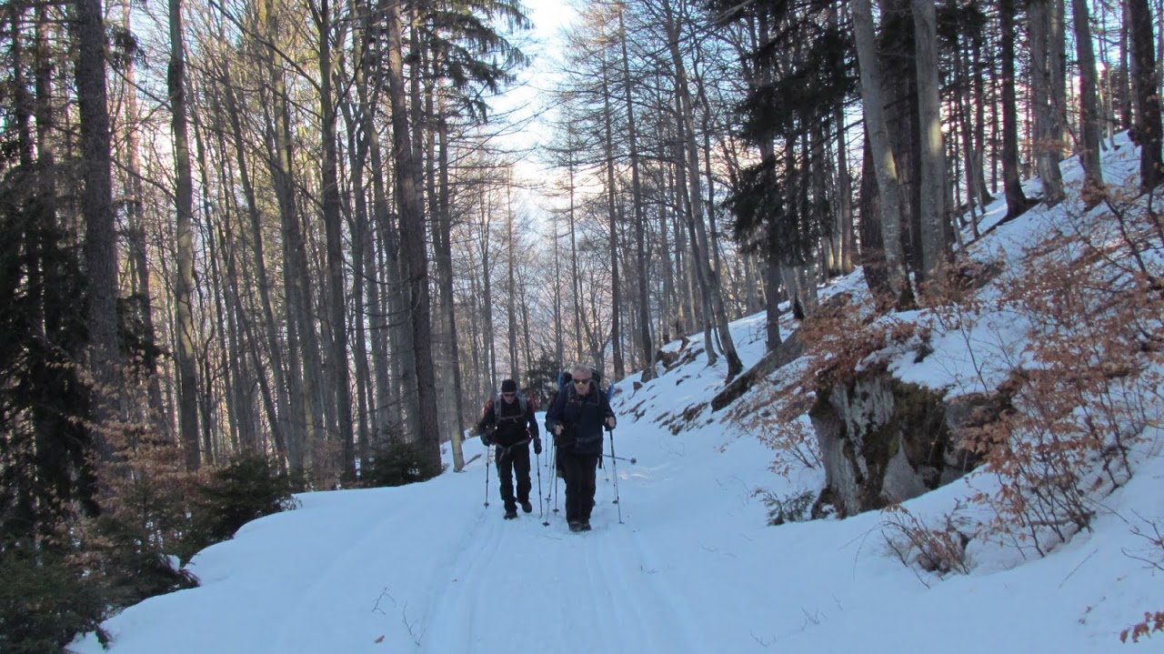 Durante la discesa incontriamo un ciaspolatore con gli attrezzi del mestiere non ai piedi, ma sulla motoslitta che lo porta rapidamente verso l’alto, mentre profuma di gasolio l’aria cristallina. Sapremo poi che andava talmente in fretta da perdere le ciaspole per strada. A noi tradizionalisti non capita sicuramente. C’è sempre qualcosa da imparare. Tre giovanotti del gruppo riescono, nel frattempo, a perdersi al lago d’Onzo e li recuperiamo più tardi mentre risalgono da Rivoria. Scopriremo poi che volevano fare il classico giro ad anello. Nessun problema di orientamento. Dopo il sofferto ricongiungimento ci separiamo, dandoci appuntamento al prossimo giovedì.