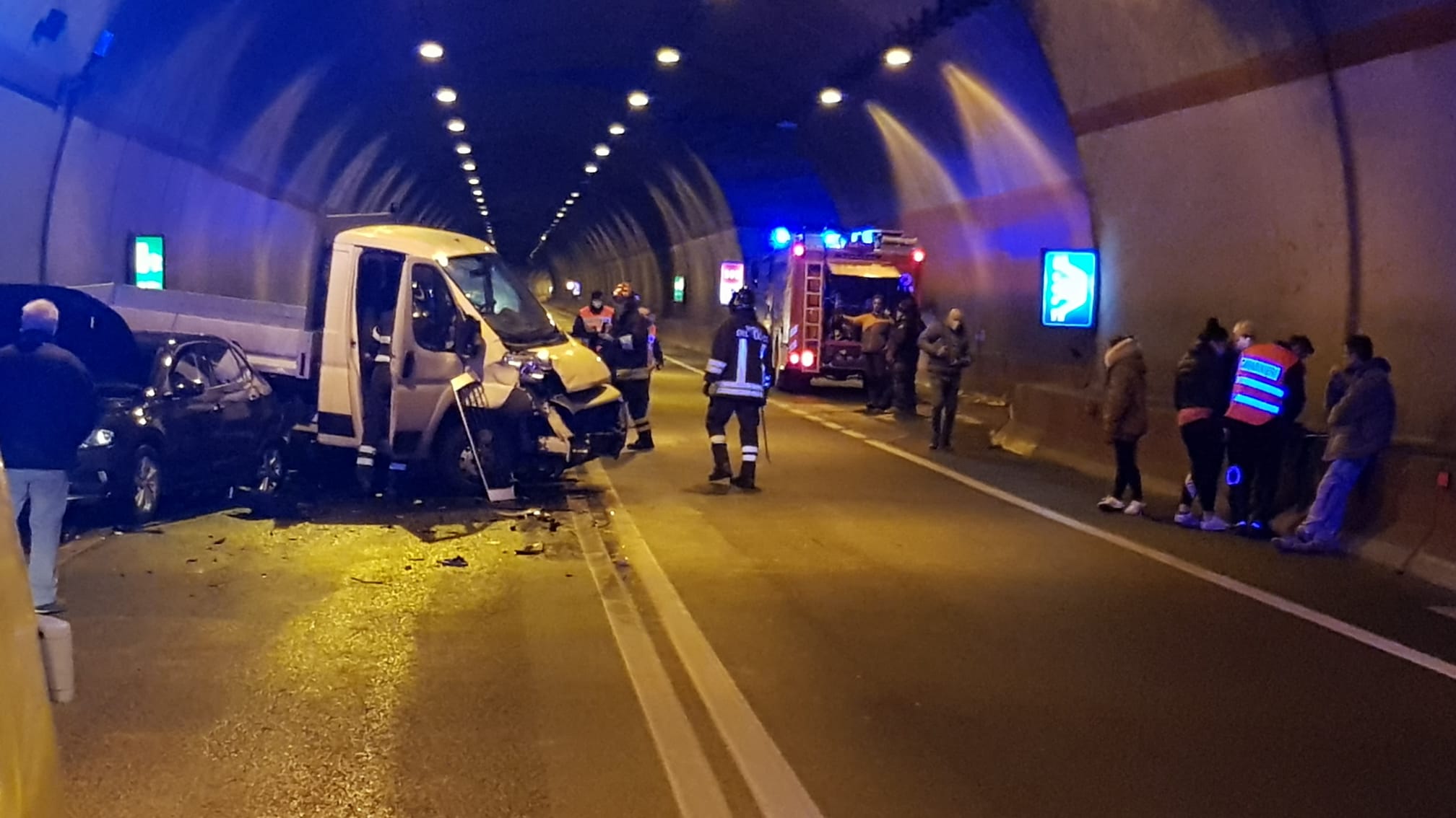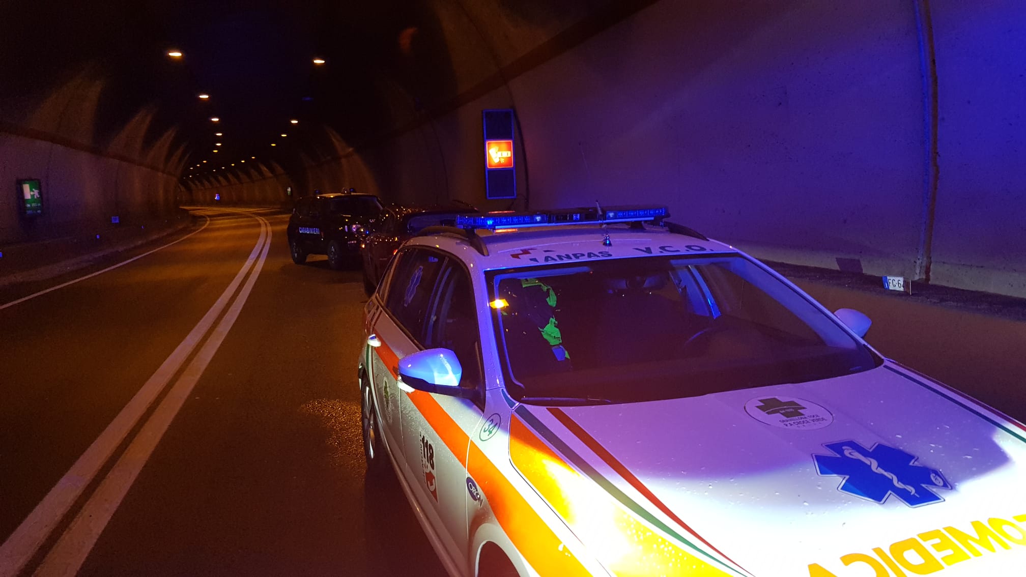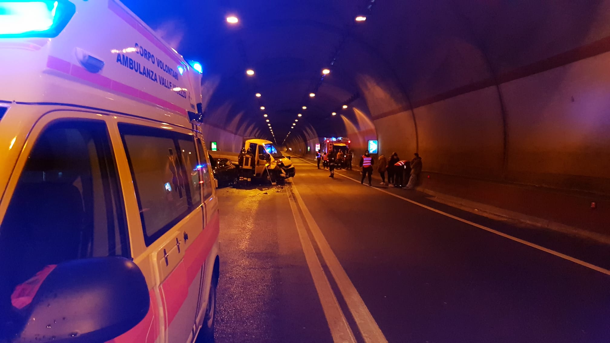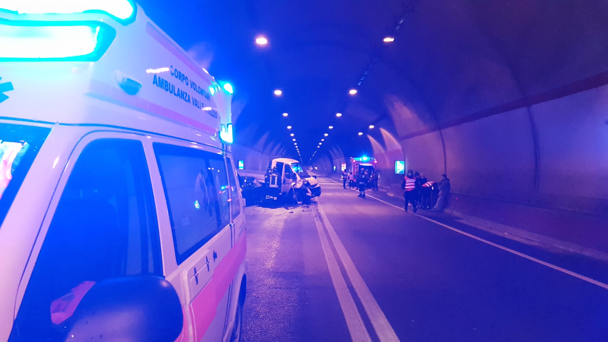 DRUOGNO- 22-01-2021-- Ci sono un furgone ed e quattro auto coinvolte nell'incidente in galleria sulla 337, a Paiesco. Sul posto anche l'ambulanza di valle, oltre ai Vigili del fuoco e i carabinieri. Sono state 12 le persone che erano a bordo dei veicoli nel tamponamento, una sola è stata trasportata a Domo all'ospedale in codice verde.