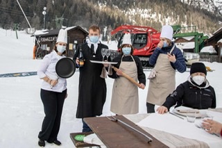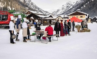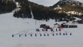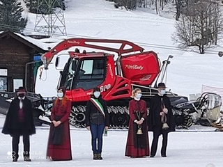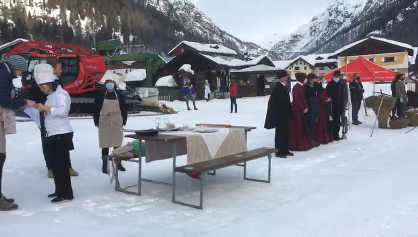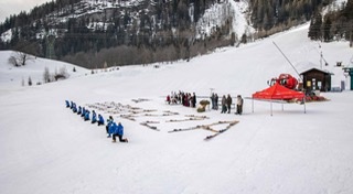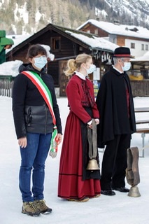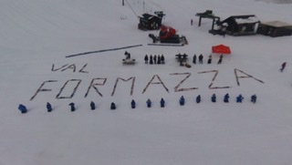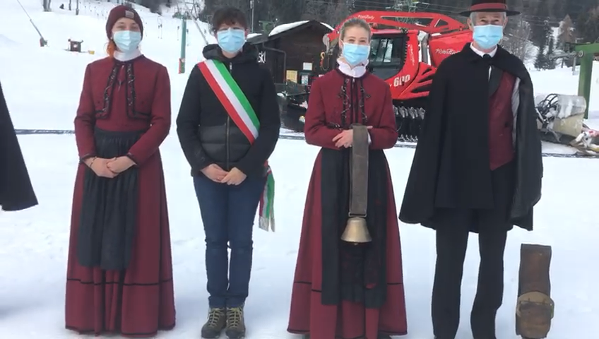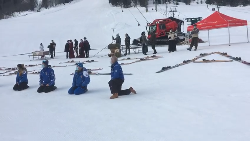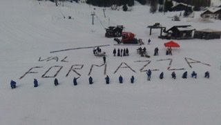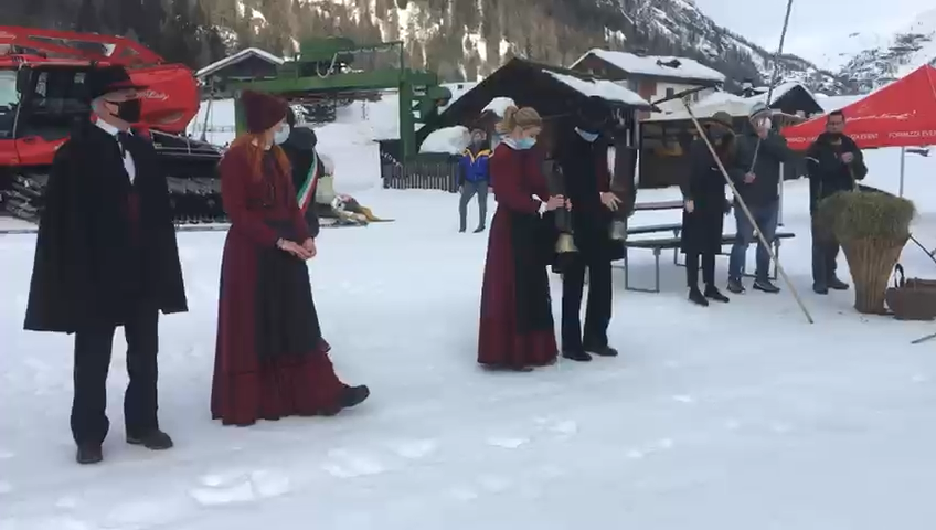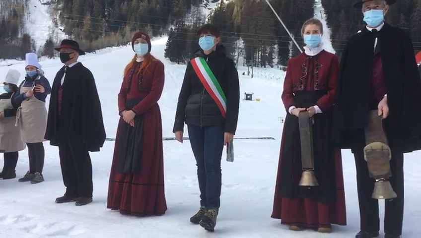 FORMAZZA- 05-02-2021-- Il sindaco Bruna Papa, le donne in costume, le campane della chiesa che per un minuto suonano nel silenzio della valle, gli operatori turistici, i maestri di sci in ginocchio, gli strumenti del loro lavoro adagiati sulla neve a formare la scritta “Val Formazza”.