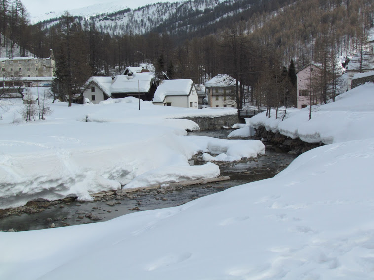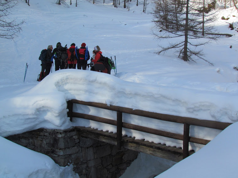 Raggiungiamo in ordine sparso Pedemonte e cerchiamo con fatica l’assetto ottimale (ciaspole, ramponcini, solo scarponi, giacca a vento oppure no e così via). Con la disposizione categorica di non intaccare le piste tracciate dagli sciatori iniziamo a salire nel bosco sulla pista evidente. Alla nostra destra la valletta in cui scorre il rio Buscagna è completamente riempita dalla neve, come mai mi era capitato di vedere. Dopo un’ora usciamo dal bosco e ci raggiunge il sole all’Alpe Misanco, 1907.