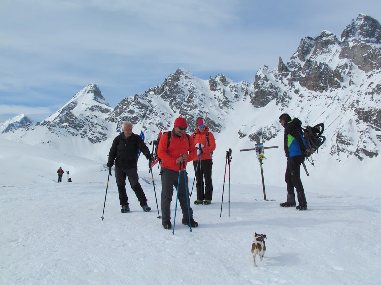 Nuvole a valle, ma solo azzurro al parcheggio di Devero, 1634. Quanta neve! Meglio puntare prudentemente al Monte Cazzola. Sarei stato oggi il solo con sci e pelli, quindi li ho lasciati a casa. Siamo in undici. Due belle signore allietano il gruppo. Quella più giovane è all’esordio e vuole scoprire perché l’anziano genitore sia ormai soggetto da tre anni al fascino irresistibile dei Trotapian. Siamo qualche grado sotto lo zero.