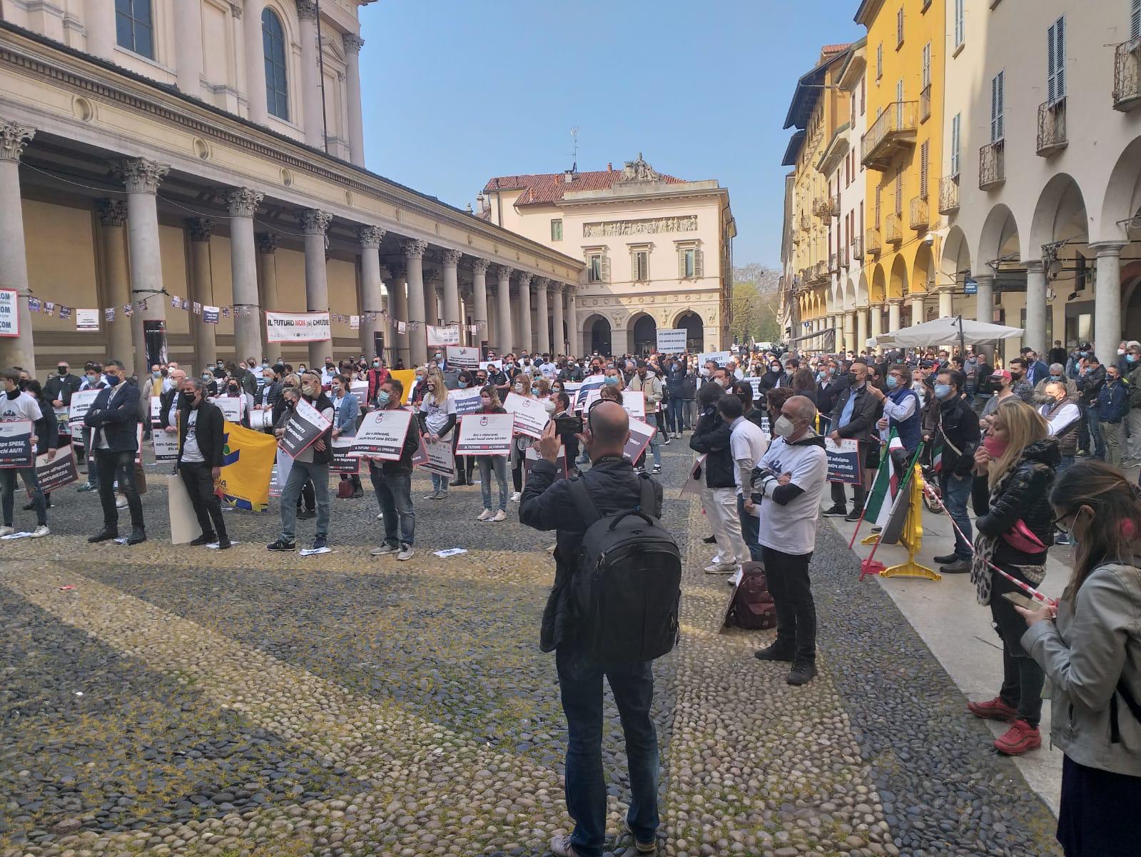 NOVARA - 01-04-2021 - Intensa partecipazione degli esercenti di VCO e Novarese che questa mattina si sono ritrovati in piazza Duomo (piazza della Repubblica) a Novara, per la manifestazione organizzata da Confcommercio Alto Piemonte contro le chiusure dei pubblici esercizi.
