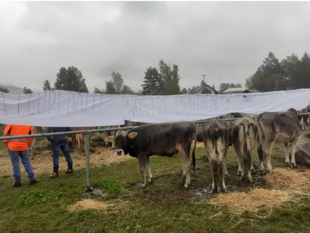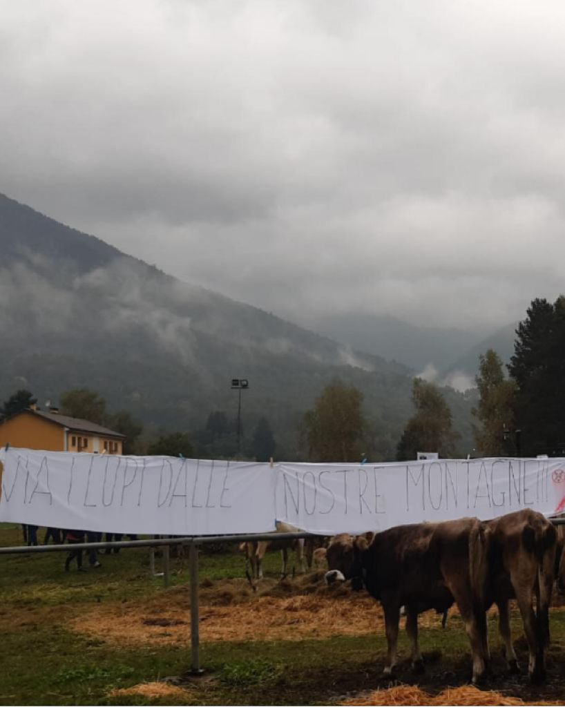 VIGEZZO- 09-10-2021-- "Via i lupi dalle nostre montagne o tutto questo finirà". Questo lo striscione esposto in autonomia da alcuni allevatori presenti alla alla 39^ Mostra Bovina della Valle Vigezzo. Nonostante il meteo avverso
